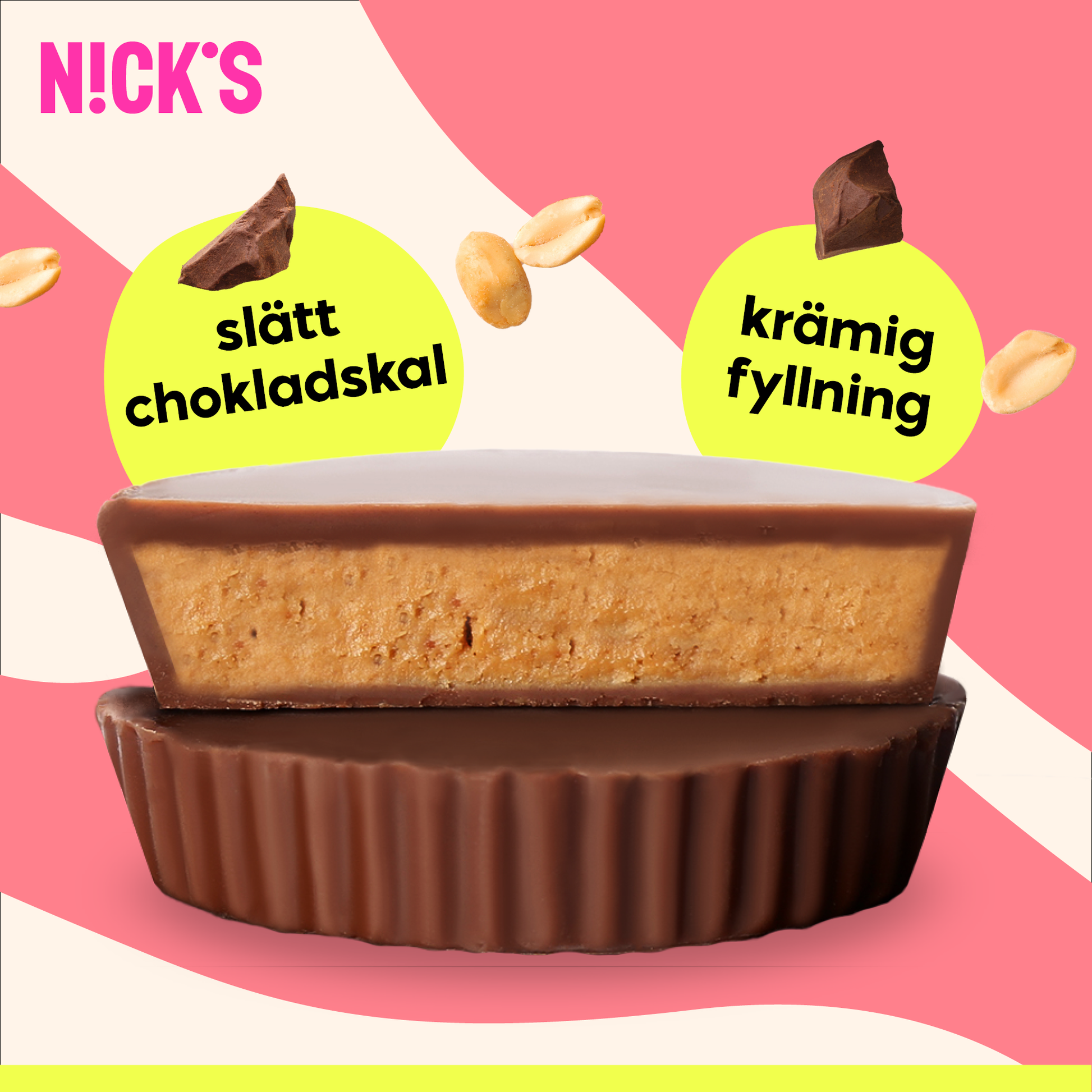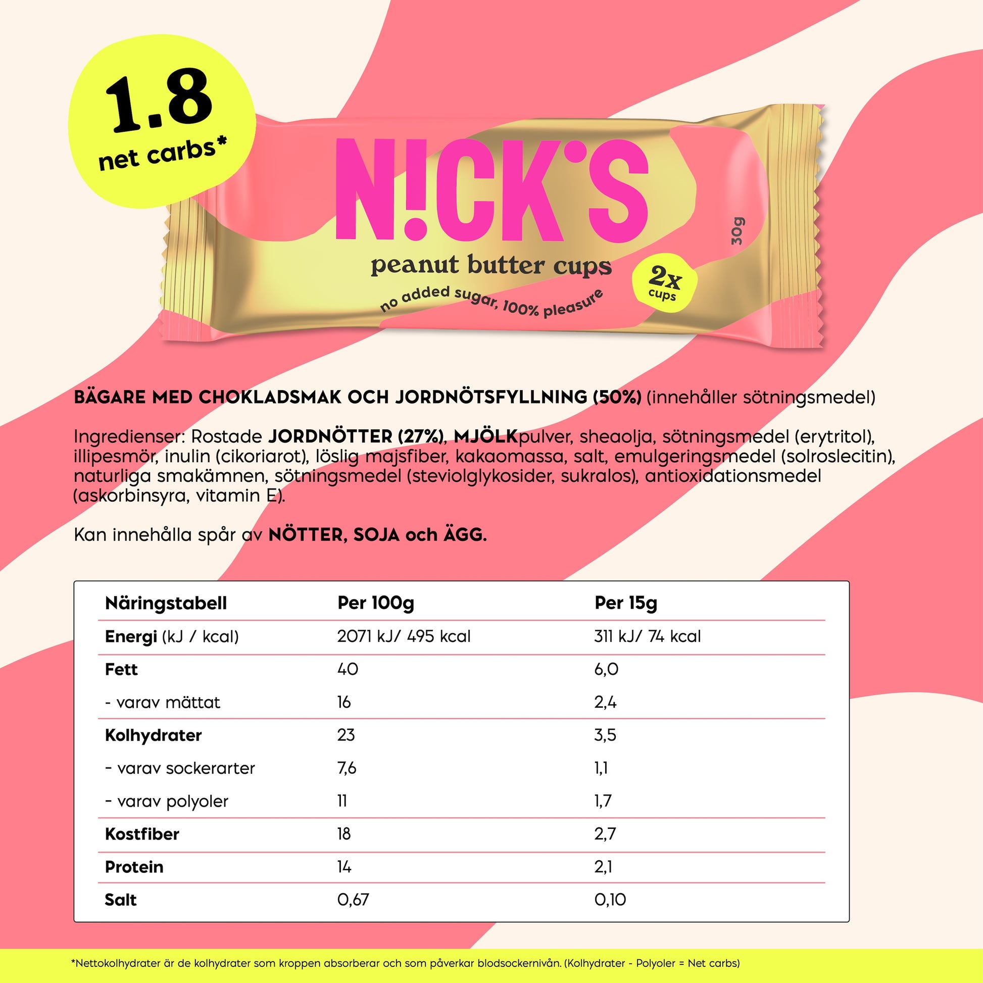 BÄGARE MED CHOKLADSMAK OCH JORDNÖTS/PEANØTFYLLNING (50%) (innehåller sötningsmedel/søtstoff) Ingredienser: Rostade jordnötter/peanøtter (27%), mjölk pulver, sheaolja, sötningsmedel (erytritol), illipesmör, inulin (cikoriarot), löslig majsfiber, kakaomassa, salt, emulgeringsmedel (solros/solsikkelecitin), naturliga smakämnen, sötningsmedel (steviolglykosider, sukralos), antioxidationsmedel (askorbinsyra, vitamin E). Kan innehålla spår av nötter, soja och ägg .