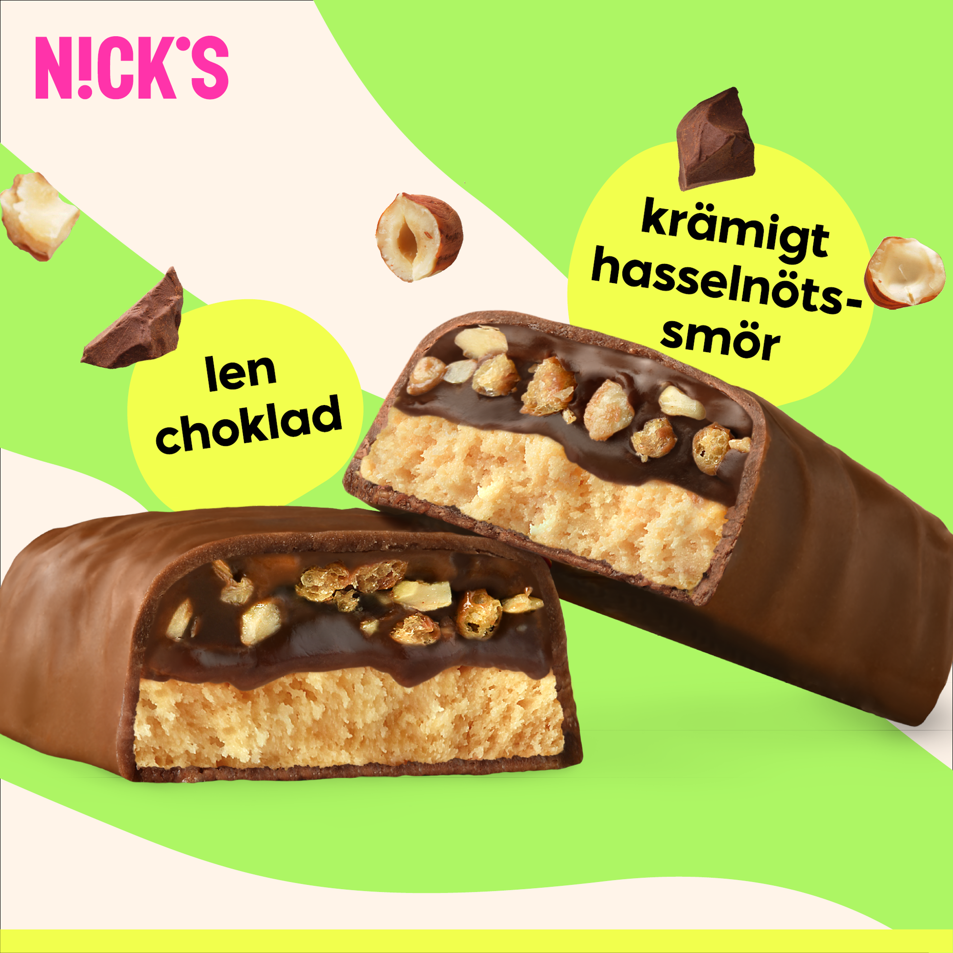 Mjölk protein, mjölk pulver, hasselnötter (9%), sötningsmedel (erytritol), vegetabiliska oljor (shea, kokosnöt, solros), hydrolyserat kollagen, fuktighetsbevarande medel (glycerol), kakaosmör, soja chips ( soja proteinisolat, tapiokastärkelse, salt), löslig majsfiber, inulin (cikoriarot), kakaomassa, kakaopulver, emulgeringsmedel (solroslecitin), naturlig arom, salt, sötningsmedel (steviolglykosider, sukralos).
